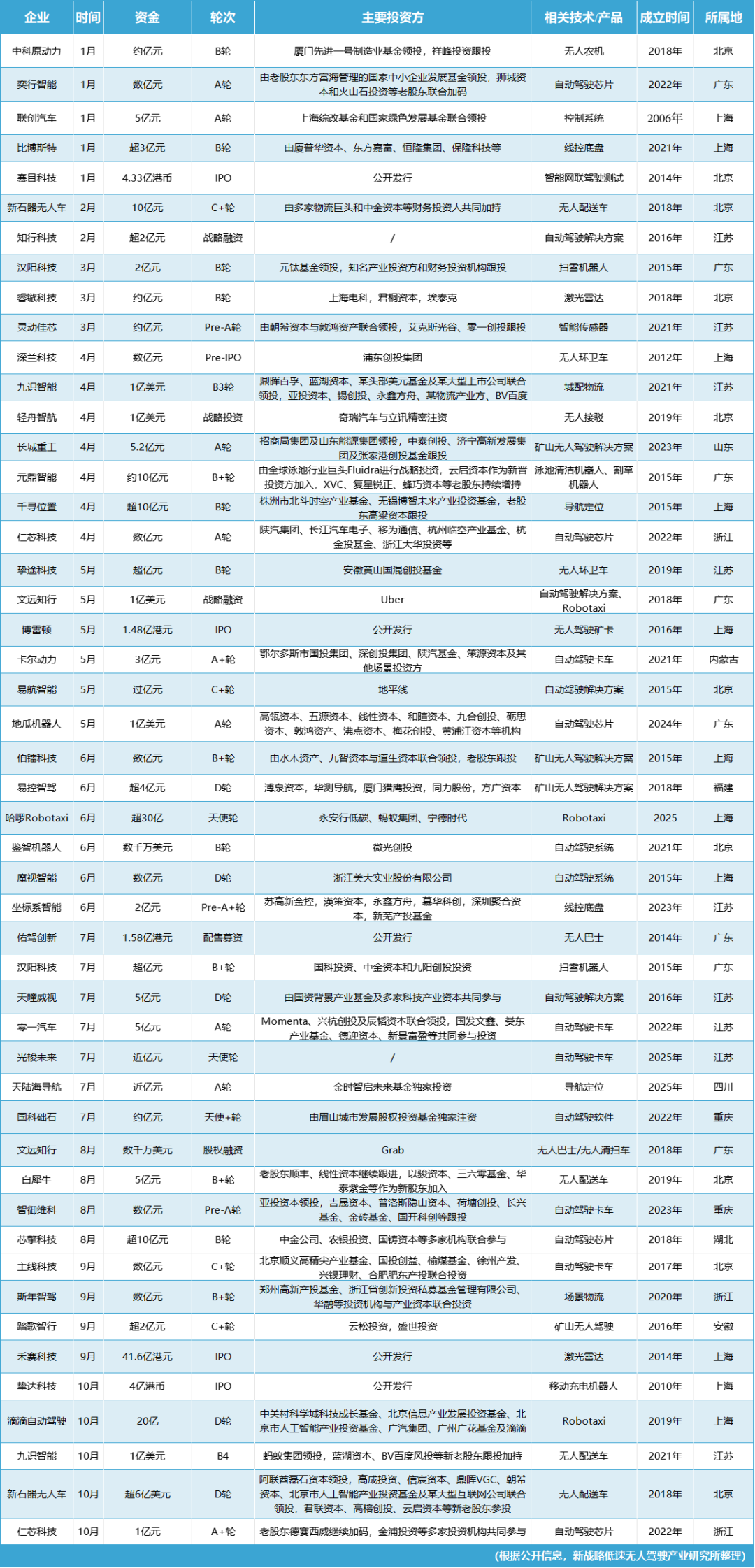 根据公开信息,新战略低速无人驾驶产业研究所不完全统计,2025年至今,国内无人驾驶领域公开超49起“亿元级别”投融资事件,融资总额近218亿元人民币(包括IPO募资)。