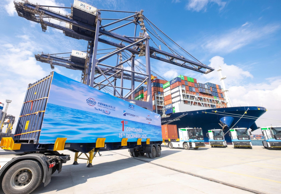 2025年12月,位于埃及苏伊士运河南入口苏科纳港(Sokhna Port)的红海货柜码头(Red Sea Container Terminals, RSCT)启动试运营,西井科技智能网联新能源重卡E-Truck联合首艘靠泊船舶完成开港第一箱。随着项目交付推进,未来将有共计40台E-Truck陆续抵港,全面助力港口智能、绿色升级。