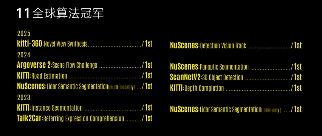 在阿里期间,团队便在顶会论文和国际算法竞赛中屡获殊荣。独立创业后,他们延续并放大了这一基因优势。公司在全球顶级公开算法挑战赛中多次战胜了英伟达和Google取得了11项全球第一。特别是在操作类机器人与无人车结合领域,成绩尤为突出。