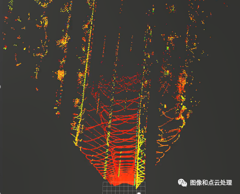 机械式激光雷达在水平方向利用外部旋转部件达到360°的采样,垂直方向根据线束的不同,分辨率也不同。较常用的有16线激光雷达,32线激光雷达,64线激光雷达。下图是一张用Velodyne-16采集的点云图: