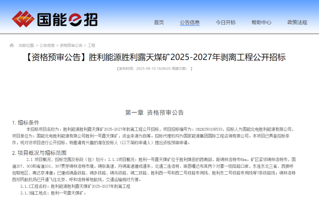 9月22日,胜利能源胜利露天煤矿启动2025-2027年剥离工程资格预审,其中提到,三年累计投放不少于198台无人矿卡。