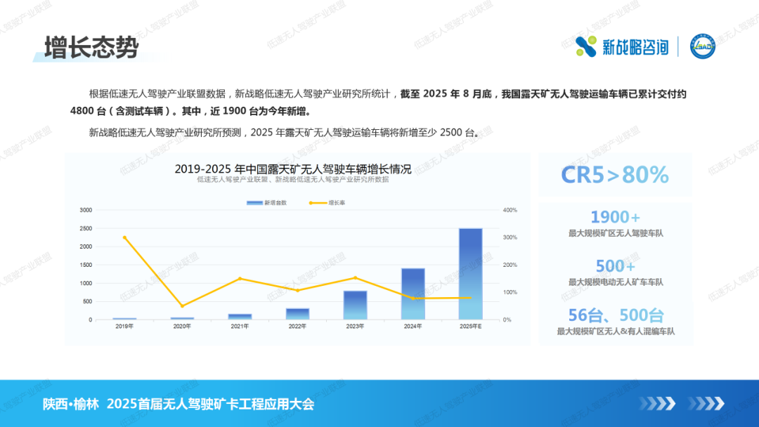 据新战略低速无人驾驶产业研究所统计,截至2025年8月底,我国露天矿无人驾驶运输车辆已累计交付约4800台(含测试车辆),其中近1900台为今年新增。新战略低速无人驾驶产业研究所预测,2025年露天矿无人驾驶运输车辆将新增至少2500台。(推荐阅读:数据首发!《中国矿区无人驾驶行业发展蓝皮书(2025版)》)