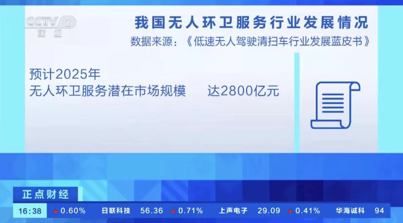 9月15日,《央视财经》特别报道深圳市的无人环卫规模运营成效,也引用了新战略低速无人驾驶产业研究所2024年发布的《低速无人驾驶清扫车行业发展蓝皮书》数据成果。