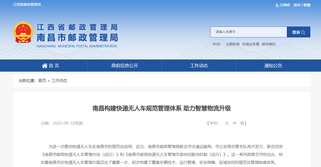 近日,江西省南昌市邮政管理局会同市交通运输局、市公安局交管支队联合印发《南昌市邮政快递无人车管理办法(试行)》和《南昌市邮政快递无人车管理市县协同联动机制(试行)》,初步构建了覆盖车辆技术、运行管理、安全保障、区域协同的规范化管理制度体系。