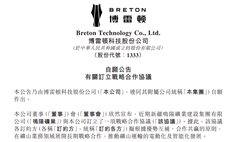 9月25日晚间,博雷顿(01333.HK)发布公告称,近期与新疆鸣阳矿业建设集团有限公司(鸣阳矿业)订立了一项战略合作协议。