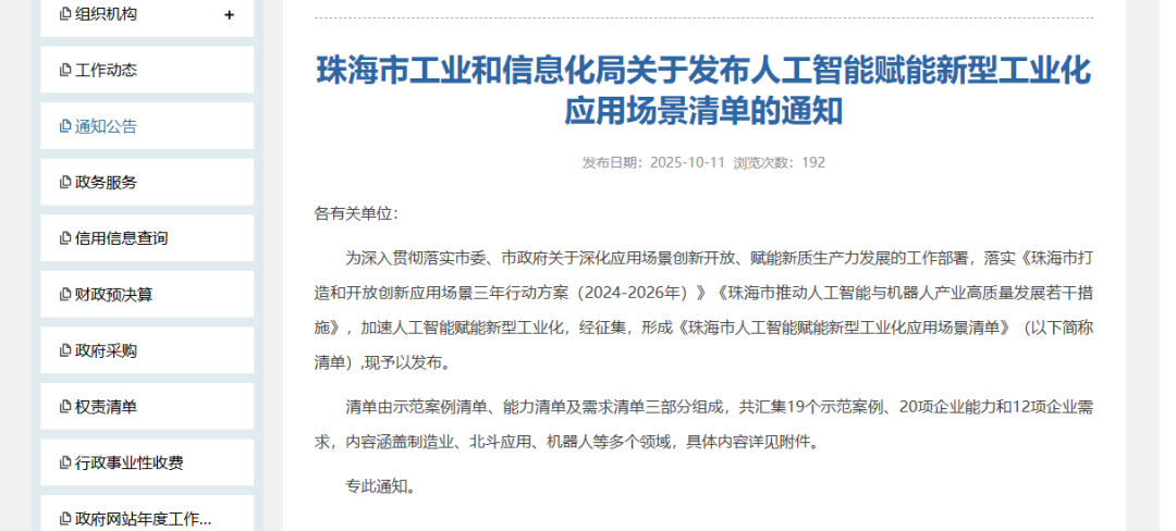 10月11日,珠海市工业和信息化局发布《珠海市人工智能赋能新型工业化应用场景清单》,由示范案例清单、能力清单及需求清单三部分组成,共汇集19个示范案例、20项企业能力和12项企业需求,内容涵盖制造业、北斗应用、机器人等多个领域。