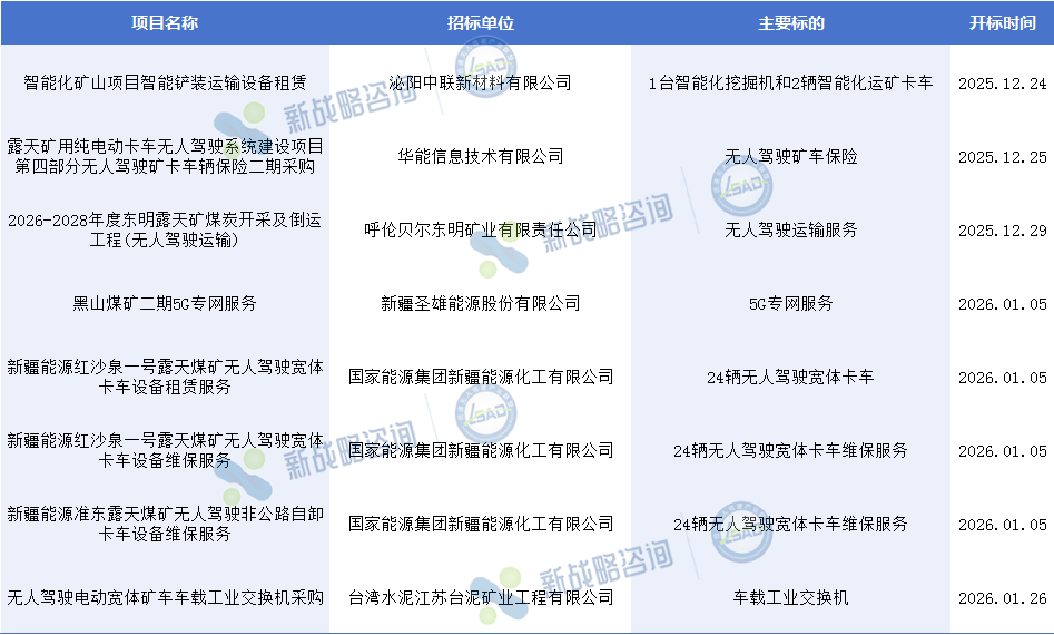 同时,新战略低速无人驾驶全媒体注意到,除了东明露天矿的公开招标项目,近期还有多个矿区无人驾驶项目也将开标,涉及无人矿车保险、设备租赁、设备维保等内容。